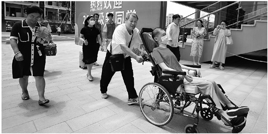 在志愿者的陪同下,立芃和爷爷特意去教学楼看了看教室。爷爷推着轮椅,一边走一边观察环境,记下从宿舍到教室的路线和时间。
